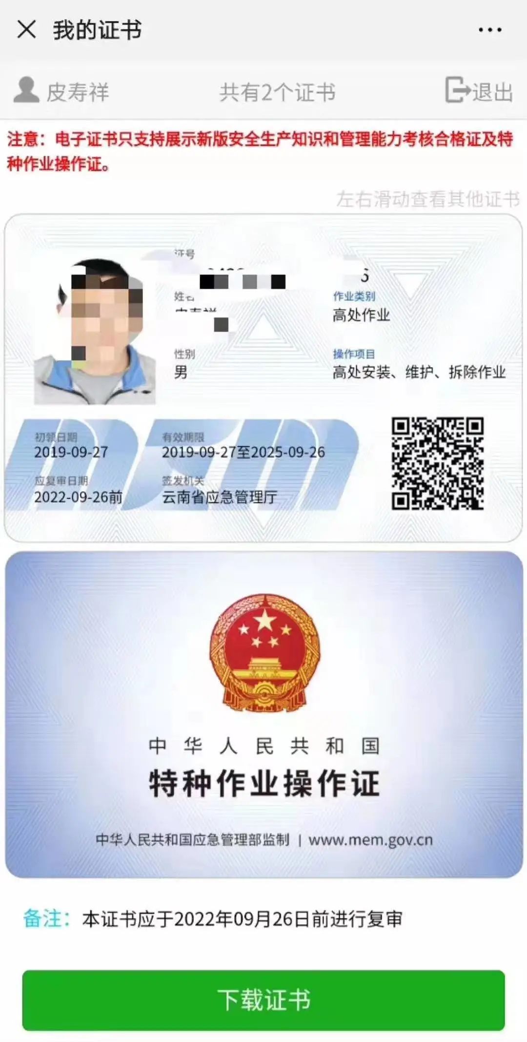 手机端电子证书: