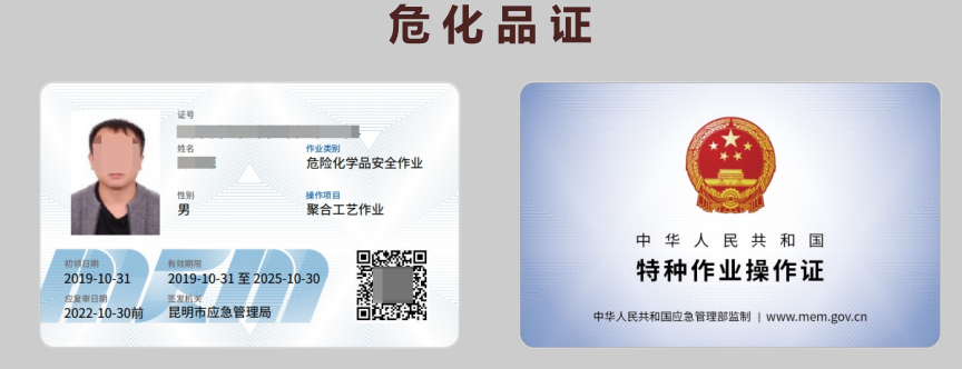 危险化学品操作定义:危险化学品操作也叫危险化学品作业证,指从事危险化工工艺过程操作及化工自动化控制仪表安装、维修、维护的作业。国家安全生产监督管理总局(以下简称安全监管总局)指导、监督全国特种作业人员的安全技术培训、考核、发证、复审工作;省、自治区、直辖市人民政府安全生产监督管理部门负责本行政区域特种作业人员的安全技术培训、考核、发证、复审工作。证书全国通用,国网查询。3年一复审,6年一换证。由国家应急管理局颁发,类似于汽车驾驶执照,上岗必备。