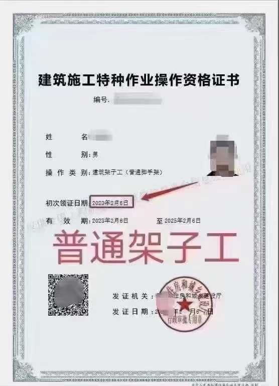 证书性质:建筑架子工证,由“云南住房和城乡建设厅”颁发,证书每2年进行一次“再教育继续学习”,如果证书过期将需要重新考取!