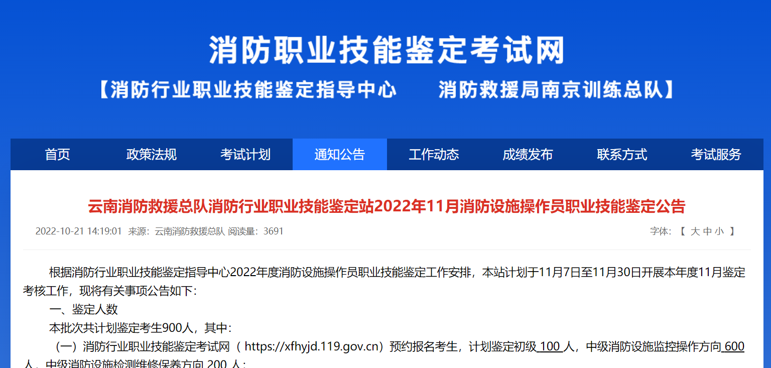 云南消防救援总队消防行业职业技能鉴定站2022年11月消防设施操作员职业技能鉴定公告