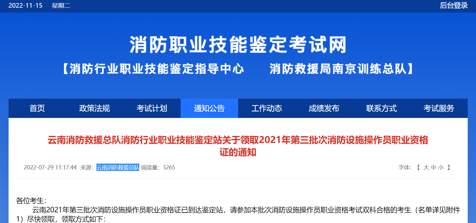 云南2022年第二批次消防设施操作员职业资格证已到达鉴定站,请参加本批次消防设施操作员职业资格考试双科合格的考生(名单详见附件1)尽快领取,领取方式如下: