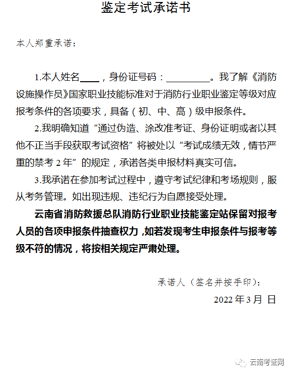 培训由由学校负责组织;鉴定考试由学员个人预约成功后,参加由云南省消防救援总队消防行业职业技能鉴定站组织的理论和实操鉴定考试,考试时间将以报名系统内的准考证时间为准。两项考试均合格的学员将由人力资源和社会保障部、应急管理部消防局联合颁发《消防设施操作员》相应等级的职业资格证。