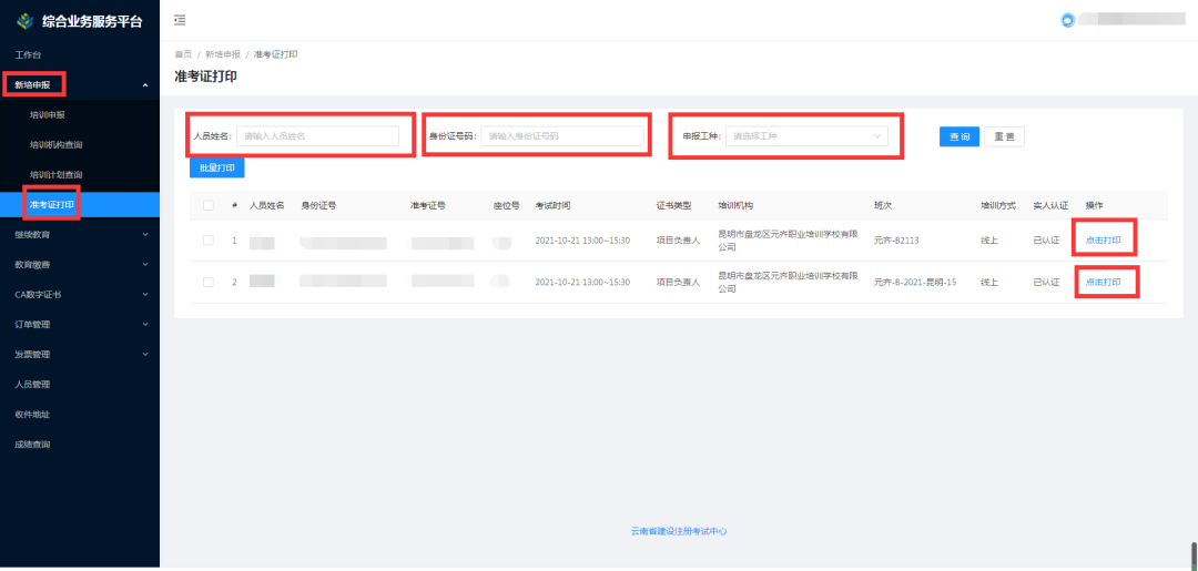 4、点击左侧工作台界面“新培申报”→点击“准考证打印”→输入“人员姓名、身份证号码”,选择“申报工种”→点击“查询”→点击“打印准考证”;