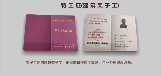 七、证书性质:建筑架子工证,由“云南住房和城乡建设厅”颁发,证书每2年进行一次“再教育继续学习”,如果证书过期将需要重新考取!